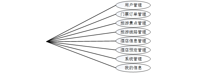 管理员模块:管理员是系统中的核心用户,管理员登录后,可以对后台系统进行管理。主要功能有用户管理、旅游景点管理、门票订单管理、旅游线路管理、酒店信息管理、酒店预定管理、系统管理、我的信息等功能。管理员用例如图3-1所示。