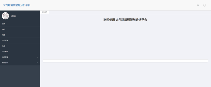管理员进入主页面,主要功能包括对用户、城市、空气质量、地图、天气预报、系统管理、我的资料等进行操作。管理员主页面如图5-7所示: