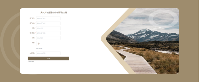 在注册流程中,用户在Vue前端填写必要信息(如用户名、密码等)并提交。前端将这些信息通过HTTP请求发送到Java后端。后端处理这些信息,检查用户名是否唯一,并将新用户数据存入MySQL数据库。完成后,后端向前端发送注册成功的确认,前端随后通知用户完成注册。这个过程实现了新用户的数据收集、验证和存储。系统注册页面如图5-2所示: