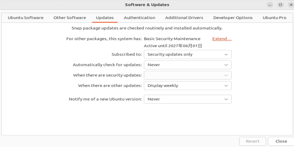 1、下图这个软件在settings->About->software&updates->updates,设置为这样,其实感觉没啥卵用,还是会有通知提示,先设置的。这样的更新提示好像都发生在重启的时候(如果联网了),如果没联网可能按其它周期提醒,我做了两个操作,目前看来是成功关闭了通知提示。2、这里的通知分两部分,一个是 Snap 软件包的更新提示,一个是系统的软件管理器更新提示。没设置前,联网,每