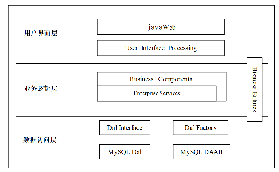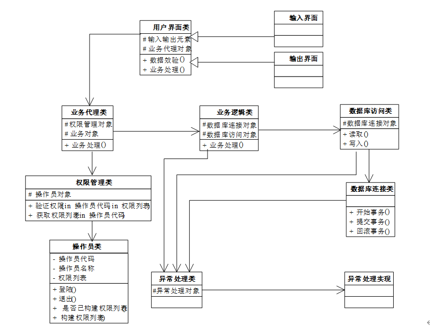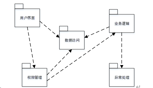 下面我们将根据架构设计原则和目标来建立系统的架构设计模型。将信息系统中对象分层,可分为三层:用户界面层、业务层、数据访问层(如下图4-2所示),再把各层中的一些公共部分提出来:权限管理、异常处理,这样得到包图如图4-3所示: