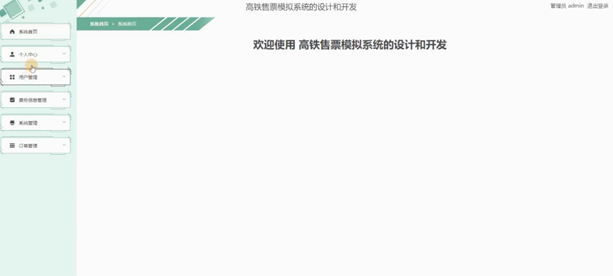管理员进入主页面,主要功能包括对系统首页、个人中心、用户管理、票务信息管理、系统管理、订单管理等进行操作。管理员主页面如图5-6所示: