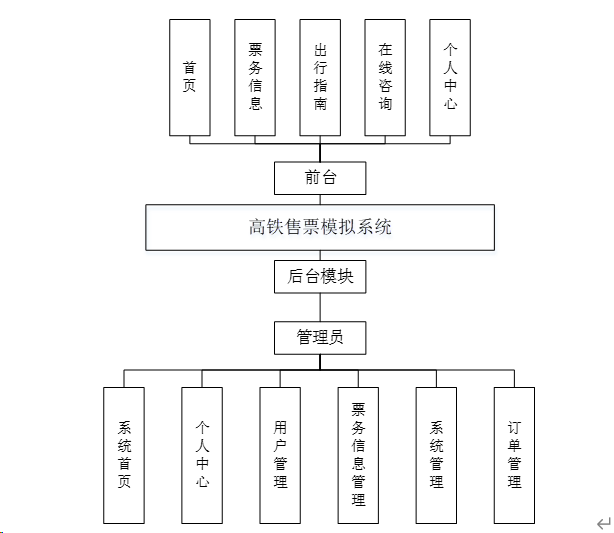 本课题要求实现优质的高铁售票模拟系统,就一定要包含有数据库、服务器相联系,从而实现系统的功能运转。系统分为管理员和用户两个角色,主要包括个人中心、用户管理、票务信息管理、系统管理、订单管理等功能。