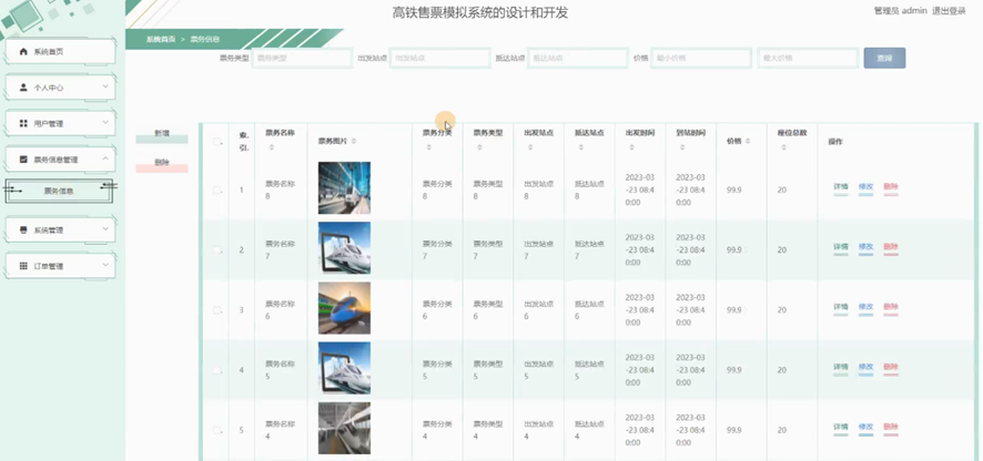 (1) 票务信息管理:管理员可以输入票务类型、出发站点、抵达站点和价格等信息来查询,新增或删除票务信息列表,并进行详情,修改和删除操作。