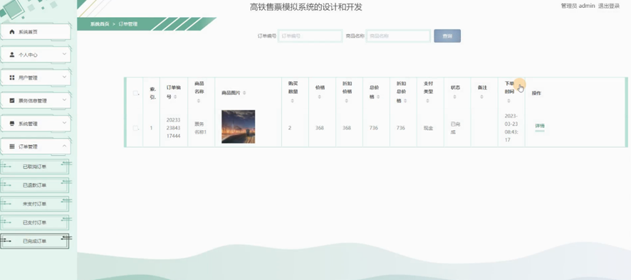 管理员点击订单管理。进入已完成订单页面输入订单编号和商品名称进行查询已完成订单列表,并根据需要对已完成订单详细信息进行详情操作;还可以对已取消订单、已退款订单、未支付订单和已支付订单进行详细操作。如图5-10所示: