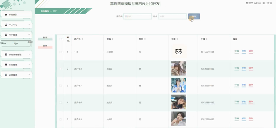 管理员点击用户管理。在用户页面输入用户名和姓名进行查询、新增或删除用户列表,并根据需要对用户详情信息进行详情、修改或删除操作;如图5-7所示: