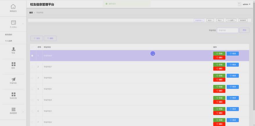 该系统采用 Java 技术、SSM 框架和 MySQL 数据库开发,结合 Vue 前端框架,实现了丰富的功能,涵盖管理员与校友多角色管理,具体包括校友信息管理、专业管理、毕业年份分类、互动交流以及系统管理等。这些功能覆盖了从校友数据维护、职业轨迹跟踪到校友互动的全流程,通过数字化手段实现了校友信息的集中整合、管理流程的规范化以及资源共享的便捷化,不仅为高校提供了高效的校友管理工具,也为校友搭建了沟通桥梁,有效推动了校友工作的信息化发展。