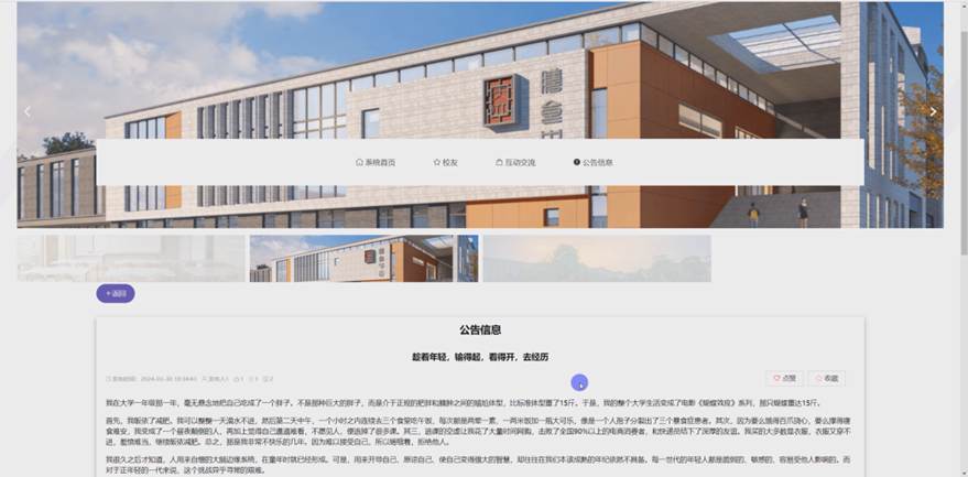 公告信息:在公告信息页面的输入栏中输入标题进行查询,可以查看到公告详细信息,并根据需要进行点赞或收藏操作;公告信息页面如图5-3所示:
