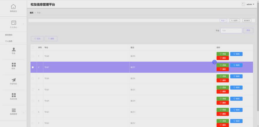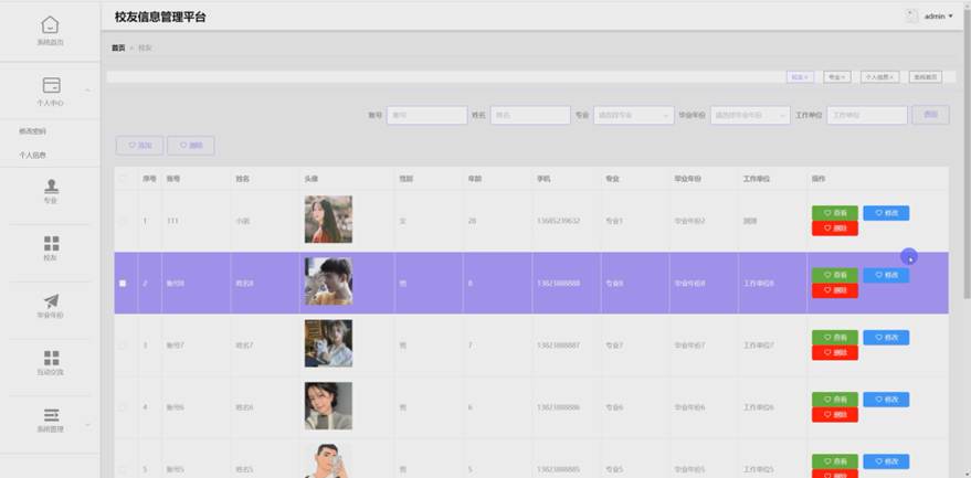 管理员进入主页面,主要功能包括对系统首页、个人中心、专业、校友、毕业年份、互动交流、系统管理等进行操作。管理员主页面如图5-6所示: