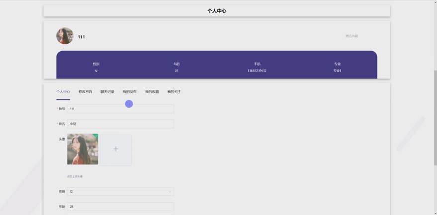 个人中心:在个人中心页面可以对修改密码、聊天记录、我的发布、我的收藏、我的关注等进行详细操作;如图5-4所示: