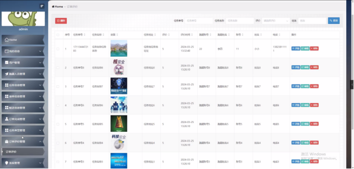 任务信息:在任务信息页面的输入栏中输入任务名称、任务单号、任务内容、任务类型、费用、接单状态、任务地址、发布时间、账号、电话进行查询,可以查看到任务详细信息,并进行评论或收藏操作;任务信息页面如图5-3所示: