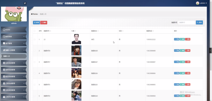 跑腿人员功能在视图层(view层)进行交互,比如点击“查询、新增或删除”按钮或填写跑腿人员信息表单。这些跑腿人员表单动作被视图层捕获并作为请求发送给相应的控制器层(controller层)。控制器接收到这些请求后,调用服务层(service层)以执行相关的业务逻辑,例如验证输入数据的有效性和与数据库的交互。服务层处理完这些逻辑后,进一步与数据访问对象层(DAO层)交互,后者负责具体的数据操作如详情、编辑或移除跑腿人员信息,并将操作结果返回给控制器。最终,控制器根据这些结果更新视图层,以便跑腿人员功能可以看到最新的信息或相应的操作反馈。跑腿人员界面如图5-9所示:
