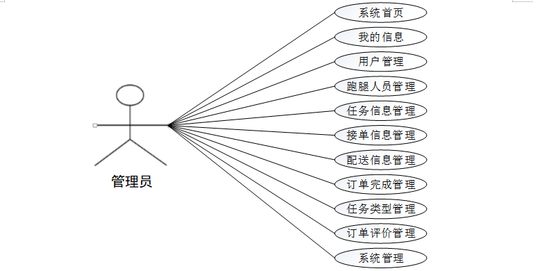 管理员登入使用本系统涉到的功能主要有系统首页、我的信息、用户管理、跑腿人员管理、任务信息管理、接单信息管理、配送信息管理、订单完成管理、任务类型管理、订单评价管理、系统管理等功能。管理员用例如图3-1所示。