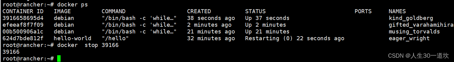 可以使用docker container stop 来终止一个运行中的容器,此外当docker容器中指定的应用终结时,容器也自动终止,restar可以将一个container重启