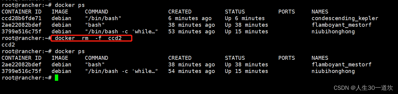 docker container rm来删除一个处于终止状态的容器,也可以使用docker rm ##,强制删除运行中的容器需要-f参数,docker会发送sigkill信号给容器