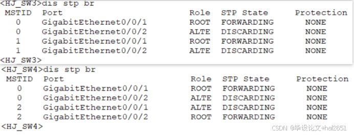 不难发现在我们的核心、汇聚交换机上配置了mstp后我们在HJ_SW3和HJ_SW4上我们不难发现上行口总有一个是堵塞的,SW3堵塞的是G0/0/2口,SW4堵塞的是我们的G0/0/1口(DISCARDING:堵塞的意思),