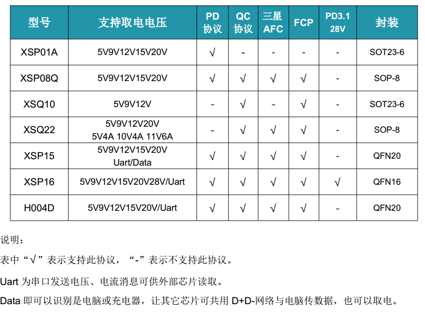 XSP01A是一款单协议取电芯片,其价格美丽的特点,是不需要太多协议支持的设备的不错选择,如需要兼容性强的取电芯片可选择XSP08Q,这款芯片支持多种快充协议取电,可兼容市面上充电器的5V9V12V15V20V电压档位,兼容性十分强大,