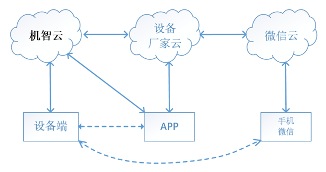 - 如图②部分,设备接入机智云后,机智云提供了面向微信应用的API,提供传输设备数据到应用、应用向设备发起的控制信息的功能。