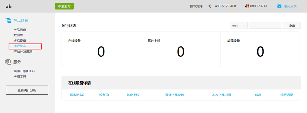 - 云端根据数据点定义,解析设备数据,用户可使用"设备运行状态","统计分析"等功能。
