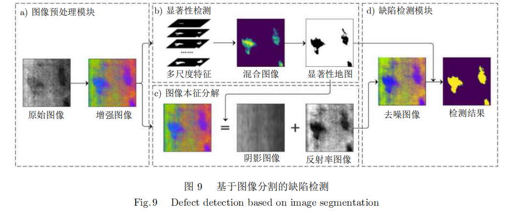 文献[59]提出了一种基于三维形态学和分水岭算法的锈蚀钢结构表面锈蚀坑识别、提取和评价的新方法。分水岭算法对微弱边缘具有良好的响应,并且可以保证得到封闭的边缘,但是存在过度分割的问题。郭皓然等[60]用全局自适应阈值法对高反射金属零件表面进行缺陷区域分割和识别,利用空域和值域信息的滤波方式对图像进行处理,并以高斯函数一阶导数构建边缘检测器,实验结果验证了方法的有效性和可靠性。魏爱东[61]用大津法(Otsu'smethod)与最大熵分割算法结合,在金属热图像缺陷识别和区域分割任务上取得了较好的效果。Prabha等[62]利用彩色通道对缺陷图像进行预处理,检测光照不均匀,对缺陷图像进行后处理,利用边缘检测和轮廓将缺陷部分从原始图像中分离出来,从而检测出产品中的缺陷,比现有方法更加稳定,过程如图9所示。Zhang等[63]基于小波变换、大津法、光谱测量(Spectral measure)和支持向量机(Support vector machine,SVM)开发了一种针对高反射金属表面的缺陷检测系统。实验表明该方法可以有效地对高反射金属表面的七种典型缺陷进行表征,优于BP神经网络方法。
