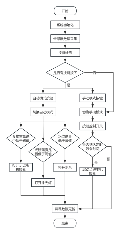 - 执行机构:步进电机(模拟喂食)、水泵(补充水分)、灯光。