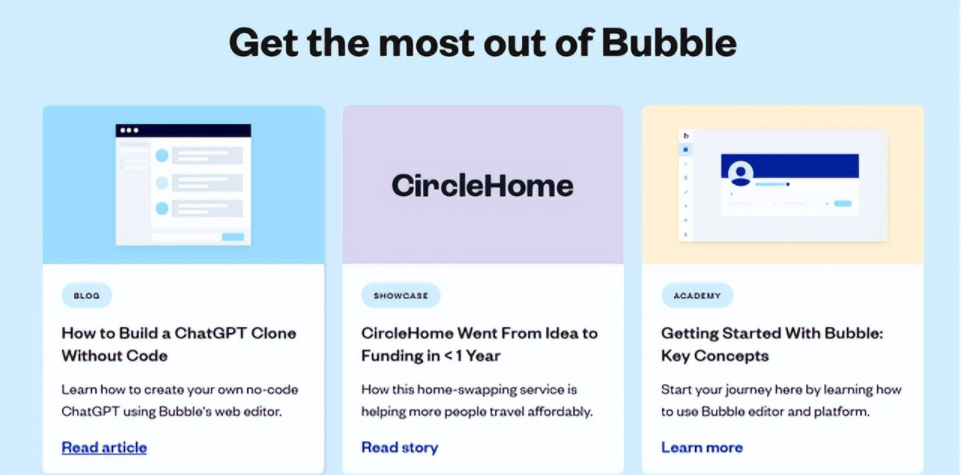 Bubble 是一个无需编程知识就能创建全功能 Web 应用的平台。它的强大之处在于能够构建复杂的交互逻辑和多用户系统,支持 SaaS 应用的开发,是初创企业和个人创业者快速验证 MVP(最小可行性产品)的理想选择。