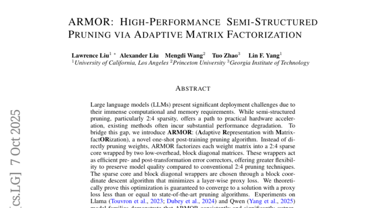 本文将深入剖析由UCLA等机构提出的ARMOR方案。它并非对现有稀疏化方法的修补,而是提出了一种全新的权重表示范式。通过自适应矩阵分解,ARMOR将模型权重重构为一种兼顾稀疏性与表达力的结构,从根本上破解了2:4稀疏的性能瓶颈。我们将对其核心原理、优化机制、实验表现及工程意义进行系统性解构。