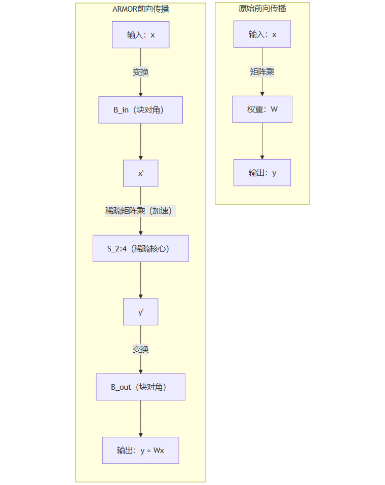 B_in和B_out并非普通的稠密矩阵。它们被设计为块对角矩阵。一个块对角矩阵由沿对角线排列的多个小规模稠密矩阵块构成,其余部分全为零。这种结构极大地减少了参数量。如果块大小为b,那么一个N×N的块对角矩阵的参数量仅为O(N*b),远小于稠密矩阵的O(N^2)。在ARMOR的实现中,b是一个超参数,通常取值为16或32,因此B_in和B_out是极其轻量级的。