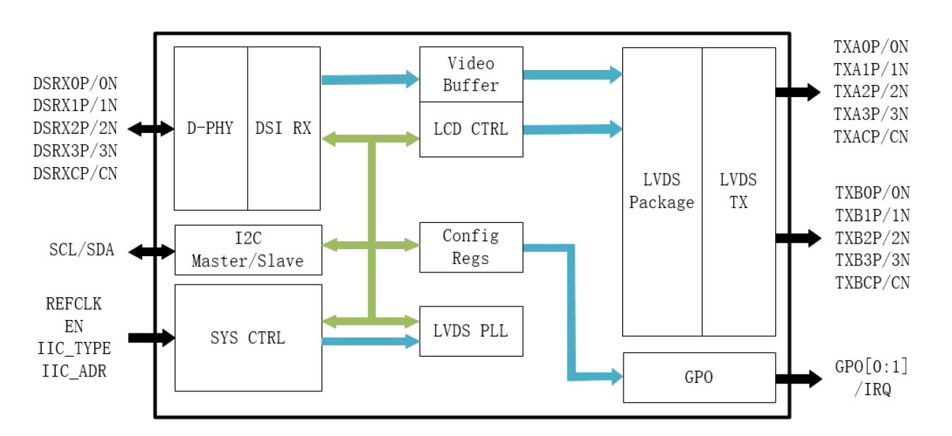 - 控制与功能:支持 I2C 或 MIPI Command 双配置方式,可实现 LVDS P/N 交换、通道顺序调整,独有的双通道 LVDS 异屏同显功能,满足分屏显示需求。