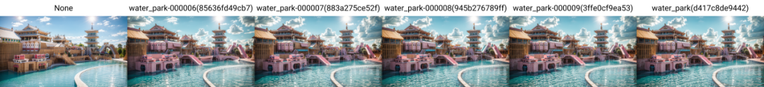 因为训练的是海盗主题水上乐园,所以将这个tag放到了最前面,接下来是对建筑的描述,后面是对配景的描述,最后补充了天气和景别的描述,这样组成了一串完整的图片tag。