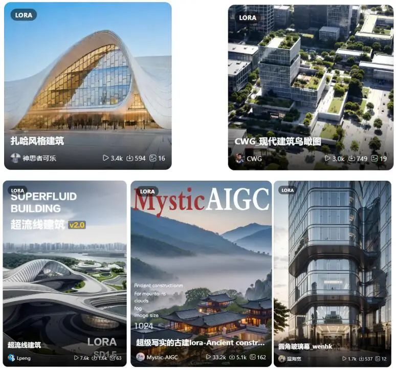 根据经验,像建筑风格/建筑师/建筑材料(幕墙、砖、半透明材料)/ 建筑类型(体育场、乡建、更新)/ 场景类型(景观、室内、鸟瞰、中庭)都是可以训练的。