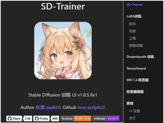 接下来就是设置训练工具了,目前最受好评的是秋叶的公开免费训练脚本,这个工具版本更新快,防呆设计优秀,同时参数调整基本能满足一般lora训练及进阶训练所需。