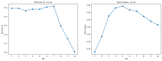 由一致性和困惑度分析曲线图可知,观测到的最佳建模主题数,数值应该取困惑度小同时一致性高的拐点,如本图最困惑度为10,最高一致性为5,以一致性为主,最优主题数5效果最好。