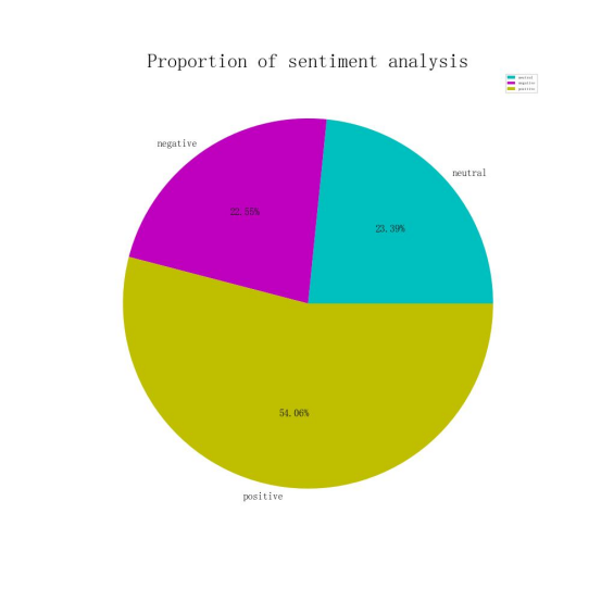 最终使用模型进行分析,分析结果会被存储到新列 情感分析 中。通过 groupby 按照情感分类统计微博数量,并用饼图展示各情感类别的占比情况。饼图通过 matplotlib 绘制,显示了每个情感类别(积极、中性、消极)的比例,以便直观展示情感分析的结果。这种方法能够帮助快速了解文本中情感的分布情况。如下图: