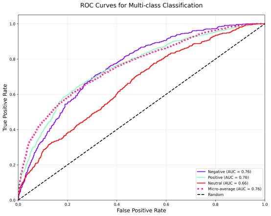 ROC曲线的分析结果进一步证实了上述发现:积极和消极类别的AUC值均为0.76,表明模型对这两类情感具有一定区分能力;而中性类别的AUC仅为0.66,分类性能明显较弱。宏观平均AUC为0.76,说明模型整体判别能力尚可,但中性类别的低效拉低了整体表现。综合来看,该模型适用于以积极和消极情感为主的二元分类场景,但对中性情感的识别需通过数据增强、样本平衡或特征优化等方法重点改进,以提升整体分类精度与鲁棒性。