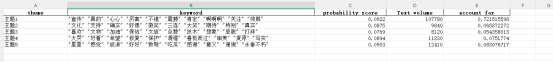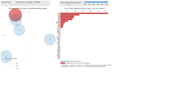通过LDA主题分析,可以发现文本数据中的主题结构和主要内容。主题分析可以帮助我们了解文本数据的内在关联性和分布情况,从而更好地理解文本数据的内容和意义。此外,LDA主题分析还可以用于文本分类、信息检索和推荐系统等领域,提供有关文本数据的深入洞察和应用价值。结果如下: