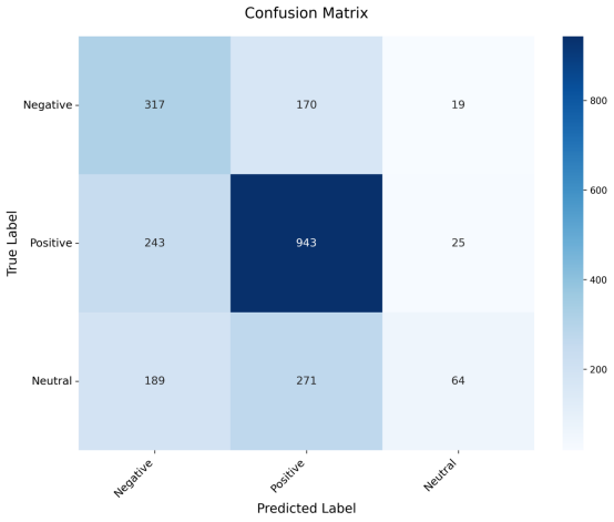 从分类性能细分来看,混淆矩阵图中,模型对不同情感类别的识别能力差异显著。积极情感类别的分类效果最好,精确率达0.68,召回率为0.78,F1分数为0.73,表明模型能较好地捕捉正面情感特征。消极情感类别的召回率(0.63)相对较高,但精确率(0.42)偏低,说明模型存在将其他类别误判为消极的倾向。中性情感类别的识别效果最不理想,召回率仅为0.12,F1分数低至0.20,绝大部分中性样本被错误划分到积极或消极类别,这反映出中性情感因语义边界模糊而难以被准确区分。