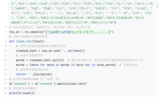 文本清洗与分词:使用正则表达式提取字符,并调用 jieba 对文本进行分词,同时去除停用词,保留有意义的词语。