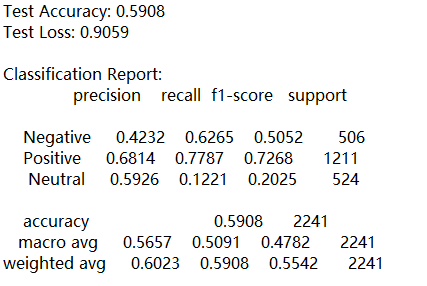 根据BERT情感分析模型的评估结果,整体表现显示模型具备一定的分类能力但仍存在明显的优化空间。在训练过程中,训练集与验证集的准确率和损失曲线均呈现收敛趋势,且未见显著过拟合现象,表明模型学习过程较为稳定。然而,模型在测试集上的最终准确率为59.08%,虽高于随机分类基线(约33.3%),但分类性能仍有较大提升余地,测试损失为0.9059也印证了这一点。