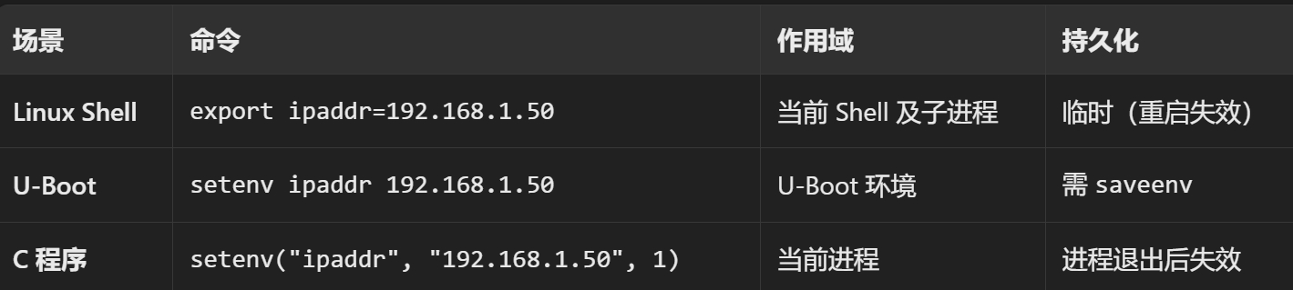 # 在 U-Boot 命令行中操作 setenv gatewayip '192.168.0.1' setenv netmask '255.255.255.0' setenv ipaddr '192.168.0.142'# 设置开发板 IP setenv serverip '192.168.0.139'# 设置 NFS 服务器 IP nfs [loadAddress] [[hostIPaddr:]bootfilename] loadAddress 是要保存的 DRAM 地址,[[hostIPaddr:]bootfilename]是要下载的文件地址。 例如:将 zImage 下载到开发板 DRAM 的 0X80800000 地址处 nfs 80800000 192.168.1.253:/home/zuozhongkai/linux/nfs/zImage 注意: 需要确保uboot可以ping通服务器,此处服务器ping不通uboot是正常的 如果ping不同,保证netdev=eth0指定网卡是谁,例如正点原子imx6ull只能使用ENET2,对应的是eth0(ENET1对应的eth1)# 工控机安装 NFS 客户端工具 sudo apt-get install nfs-common # 创建本地挂载点 sudo mkdir -p /mnt/nfs # 挂载远程 NFS 共享 sudo mount -t nfs 192.168.1.253:/home/user/linux/nfs /mnt/nfs # 取消挂载,断开与 NFS 服务器的连接 sudo umount /mnt/nfs 如果出现umount.nfs4: /mnt/nfs: device is busy sudo umount -l /mnt/nfs # -l 表示懒惰卸载 # 检查挂载列表,确认 /mnt/nfs 已消失 mount | grep nfs