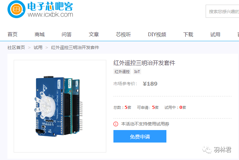 此外再给大家介绍一下如何免费使用到自己心仪的开发板,一般来说,厂商、还有一些博主为回馈粉丝会有各种活动抽奖,我们可以关注这些活动,但是这些活动一般狼多肉少,获奖概率也比较低;再一种就是从一些技术论坛去申请样片使用,当然技术论坛申请是有要求的,会要求你写一定的文章作为反馈。这次我就是从电子芯吧客申请的免费使用的样片。上次我公众号也发了与非网的样片申请活动,大家有兴趣也可以多多关注类似的活动哈。