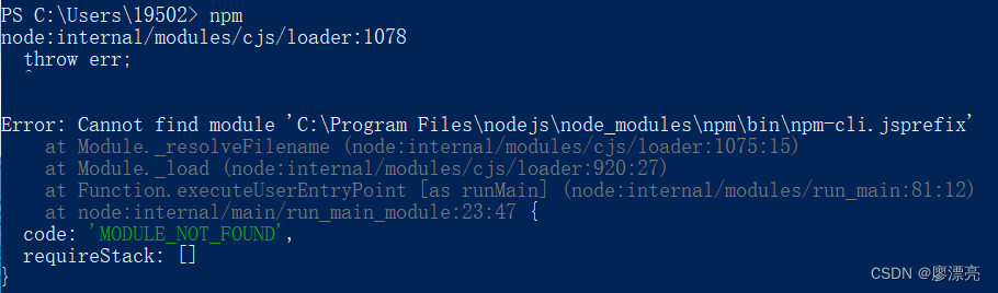 只得根据最新报错,参考大佬博文(解决使用npm出现Error: Cannot find module ‘C:\Program Files\nodejs\node_modules\npm\bin\npm-cli.jsprefix‘报错_npm error: cannot find module-CSDN博客),这次通过重新下载nodejs,成功解决。