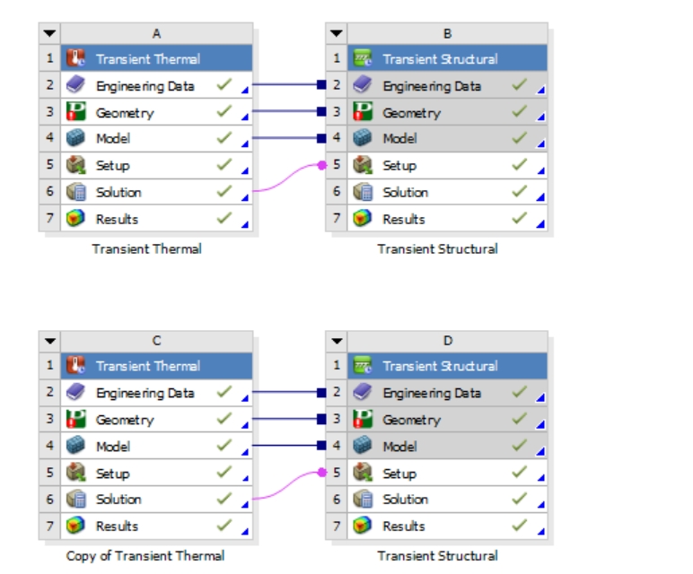- 关键步骤是通过DataTransferFrom函数将热分析的温度结果(Solution组件输出)作为结构分析的温度载荷,实现热力耦合,模拟温度变化引起的热应力与变形。 - 求解与结果更新