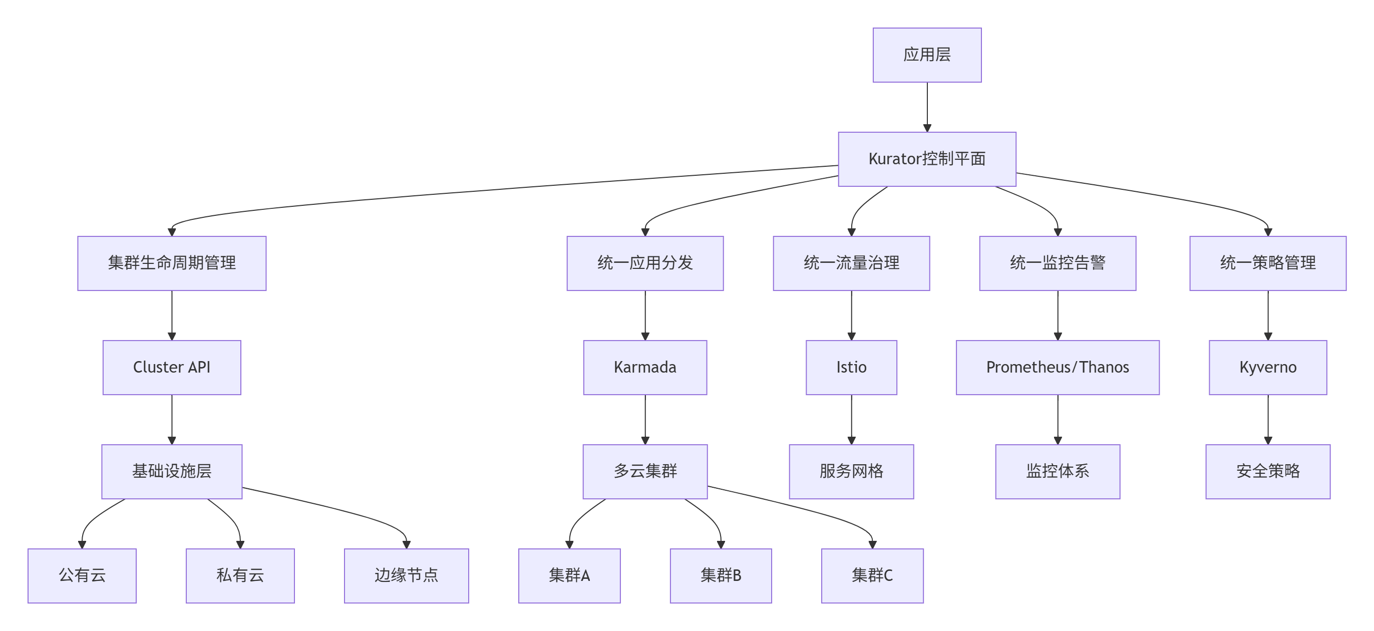 这种架构的优势在于关注点分离和控制平面抽象。Kurator作为统一控制平面,负责全局决策和策略管理,而具体的执行由各集群的Kubernetes控制平面完成。