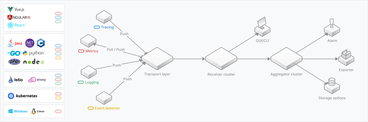 Probes(探针): 收集遥测数据。包括各种格式(SkyWalking,Zipkin,OpenTelemetry,Prometheus,Zabbix等)的指标,跟踪,日志和事件