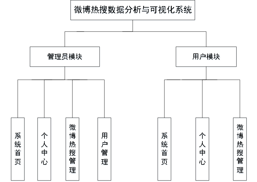 系统功能结构图是系统设计阶段,系统功能结构图只是这个阶段一个基础,整个系统的架构决定了系统的整体模式,是系统的根据。微博热搜数据分析与可视化系统的整个设计结构如图4.1所示。
