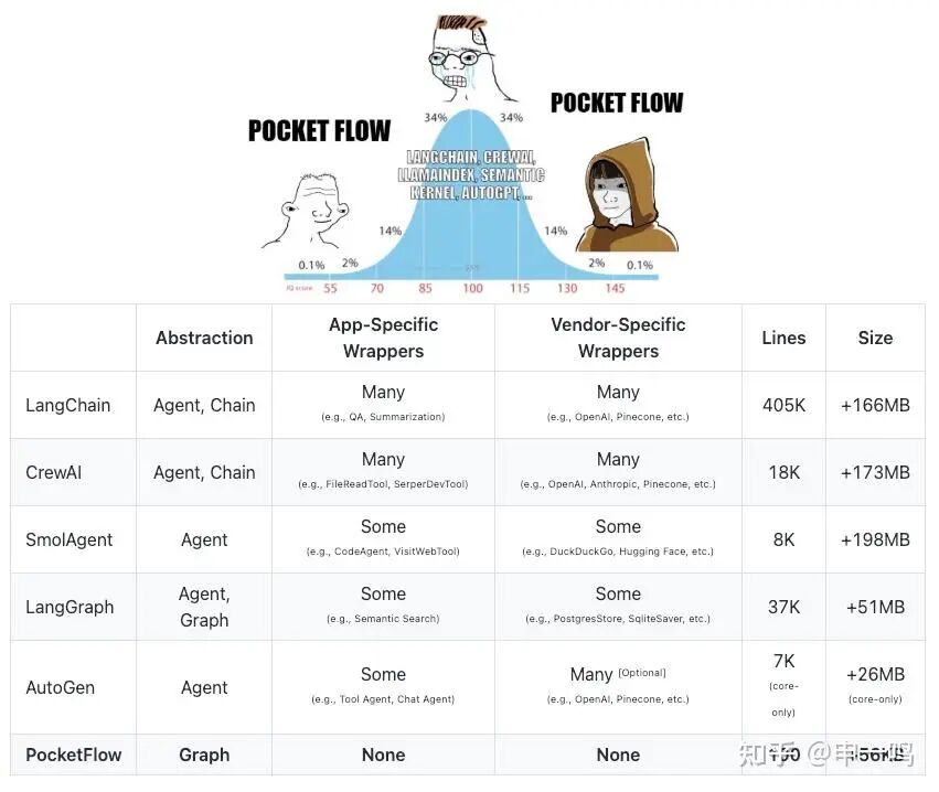 上述功能通常是既有的成熟框架会考虑到的,它们历经无数开发者的上千 commit 和 PR 的迭代打磨才逐步完善。而开发者在首次启动 Agent 项目时时往往更专注核心功能和流程的实现,对于后期的维护和质量评估则想不到那么多,最终不可避免地造成各种麻烦。到了这个阶段,开发者开始寻求专注于特定功能的模块化开发框架,避免大包干式的单一框架强耦合依赖,而是在高自由度和维护友好之间寻找平衡点,例如专注于流程编排的 PocketFlow、专注于简化模型调用和结果分析的 Ell,以及专注于模型验证和依赖注入的 Pydantic AI 等等。它们不试图做所有事,但以解决某一类问题为导向,模块化按需组合的思路,逐渐成为 Agent 开发框架演进的重要方向。这一开发框架层面的迭代,实质上反映了开发者对不同抽象层级粒度需求的变化*(当然,考虑到 Langchain 是强行喂给开发者的,它是否真正代表过开发者的需求尚未可知)*。