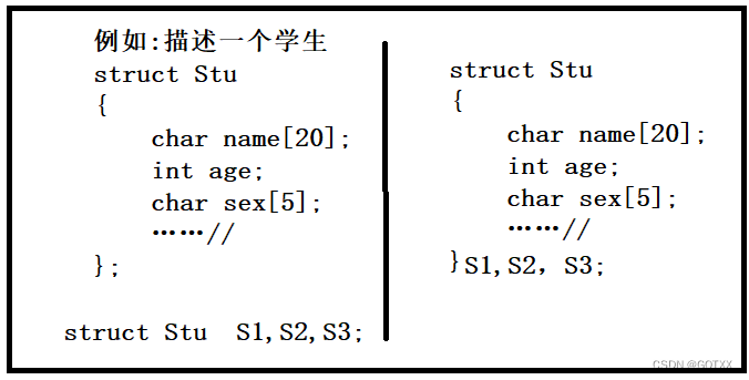 第一种:就是先进行结构体申明后,再创建结构体变量 (是全局变量) 如图左边;