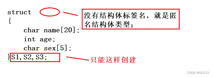 注意:匿名结构体类型(不完全的声明),创建结构体变量时,只能用上面的第二种方式;(如图)