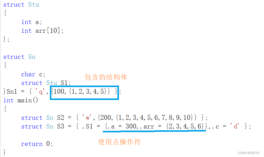 结构体是用大括号括起来的,所以当一个结构体里面含另一个结构体时,里面的结构体也需要用大括号;